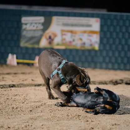 Während dieser Zeit steht das "Toben" im Vordergrund. Wir beobachten ebenfalls das Sozialspiel und erläutern das Hundeverhalten, mit dem Ziel, den eigenen Hund noch besser zu verstehen. Außerdem geben wir Hinweise, wann es Sinn macht, in das Spiel einzugreifen.